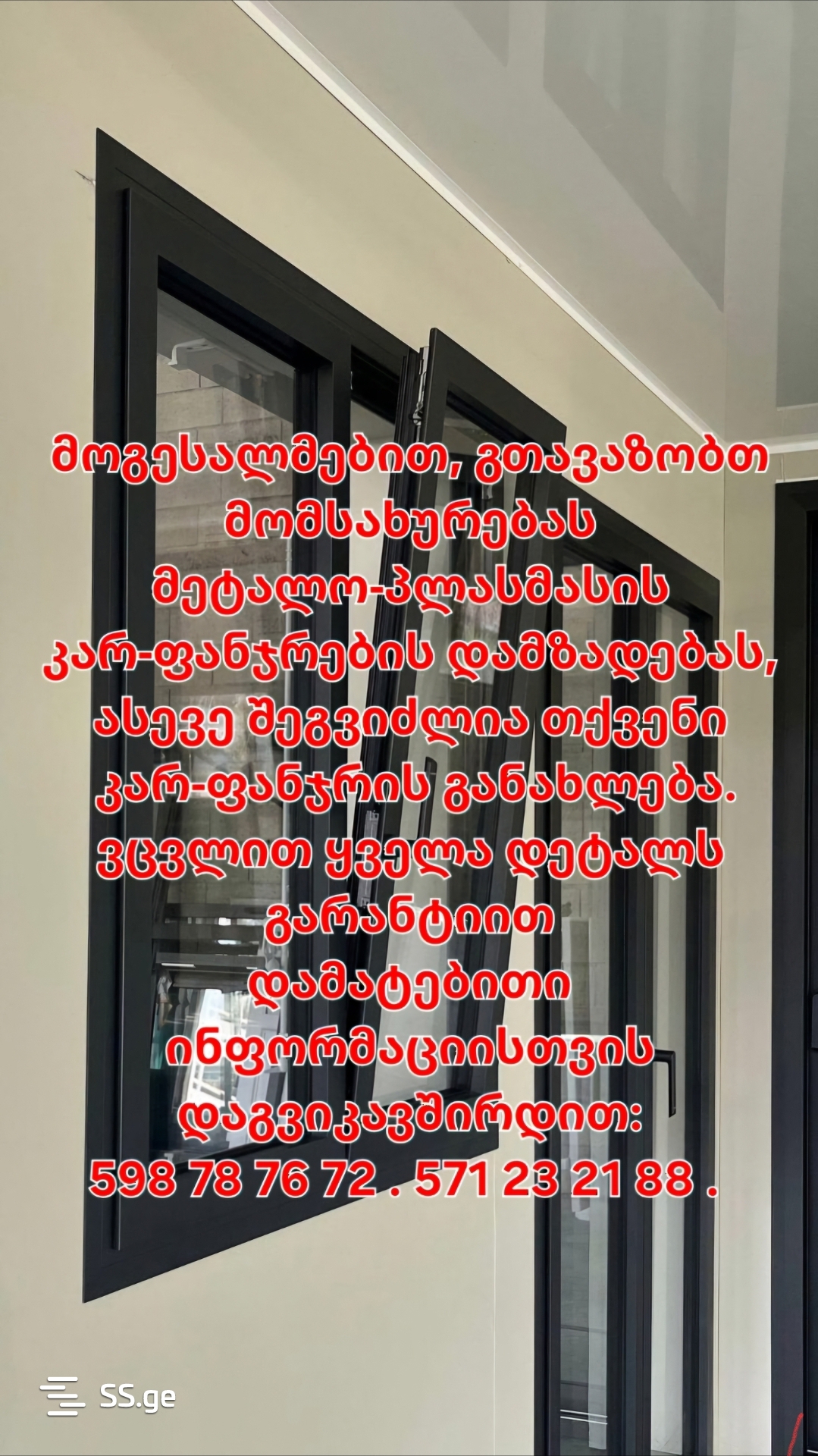 დაგეგმეთ თქვენი კარ-ფანჯრის მონტაჟი და შეკეთების სამუშაოები მარტივად — დაგვიკავშირდით მითითებულ ნომერზე სრული ინფორმ