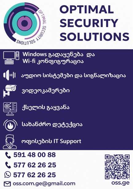 სანდო და თანამედროვე უსაფრთხოების სისტემა — OSS 🔒 OSS გთავაზობთ სრულ მომსახურებას: ვიდეოკამერების მონტაჟი და გაყიდვა ელექტრო და ჭკვიანი საკეტების დაყენება ფინგერპრინტ სკანერების ინსტალაცია აუდიო სისტემები და მულტიმედია ცეცხლსაწინააღმდეგო დეტექტორები და სიგნალიზაცია ქსელის გაყვანა ოფისებში ✨ ჩვენი მიზანია თქვენი სახლისა და ბიზნესის სრული დაცვა და კომფორტი. OSS — თქვენი უსაფრთხოების ყველაზე საიმედო პარტნიორი!