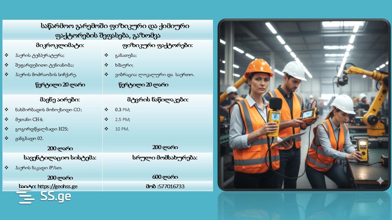 საწარმოო გარემოში გაზომვები: ფიზიკური ფაქტორებიs, ქიმიური ფაქტორების, ხმაურის, განათების მავნე აირების ვიბრაციის. დაკალიბრებული ხელსაწყოებით