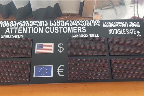 სარეკლამო კომპანია ✫ ლედ 1 ✫ გთავაზობთ სავალუტო ტაბლოების დამზადებას, პროგრამირებას და მონტაჟს. ნებისმიერი ზომის, ფერის და დიზაინის სავალუტო ტაბლოები. დაგიმზადებთ საუკეთესო ფასად! უმოკლეს ვადებში! ხარისხის გარანტიით! სახარჯი მასალები გათვლილია გარე მონტაჟისათვის, ჩვენთან არსებული კლიმატური პირობების გათვალისწინებით. ფასები ანგარიშდება ზომების მიხედვით და მოიცავს დღგ-ს თანხას! ✫ გამოკვეთე შენი ბიზნესი და გახადე შესამჩნევი! ✫ ✉ myled168@gmail.com